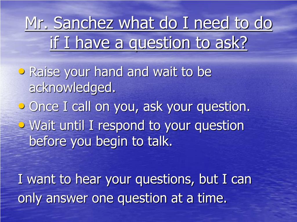 Mr. Sanchez what do I need to do if I have a question to ask? • Raise your hand and wait to be acknowledged. • Once I call on you, ask your question. • Wait until I respond to your question before you begin to talk. I want to hear your questions, but I can only answer one question at a time.