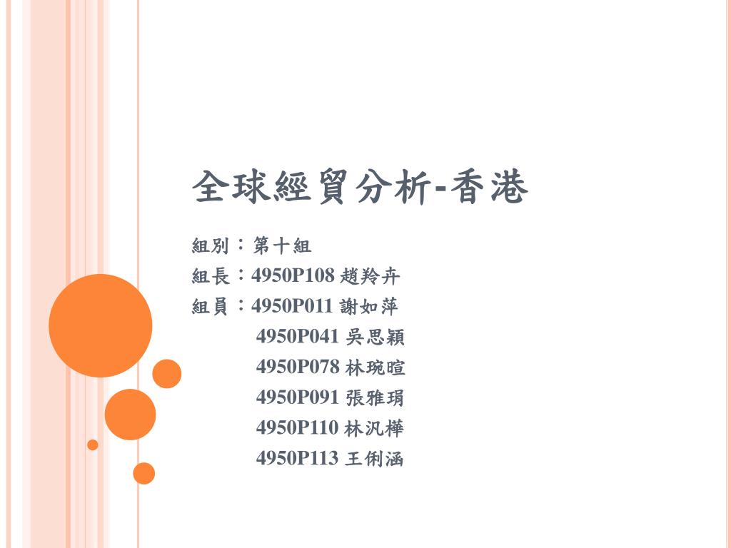 全球經貿分析-香港 組別:第十組 組長:4950P108 趙羚卉 組員:4950P011 謝如萍 4950P041 吳思穎 4950P078 林琬暄 4950P091 張雅琄 4950P110 林汎樺 4950P113 王俐涵