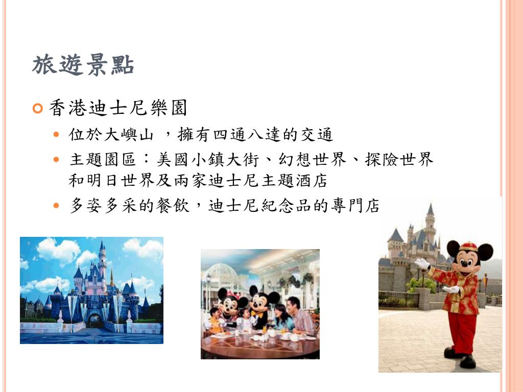 旅遊景點 • 香港迪士尼樂園 • 位於大嶼山,擁有四通八達的交通 • 主題園區:美國小鎮大街、幻想世界、探險世界和明日世界及兩家迪士尼主題酒店 • 多姿多采的餐飲,迪士尼紀念品的專門店