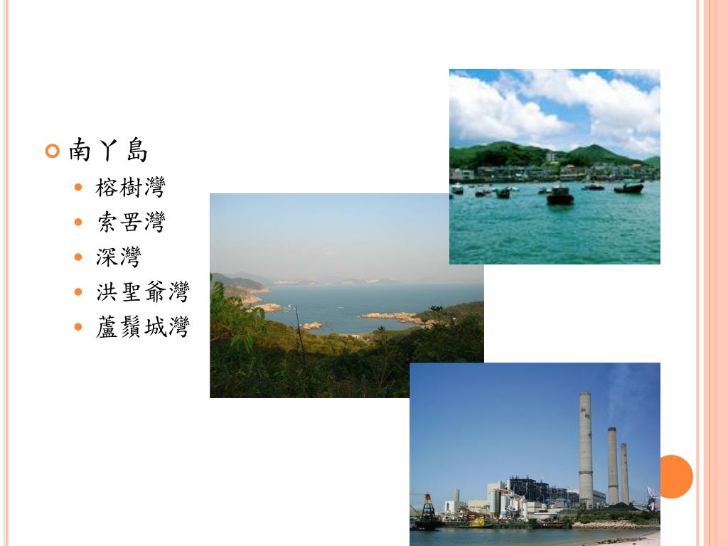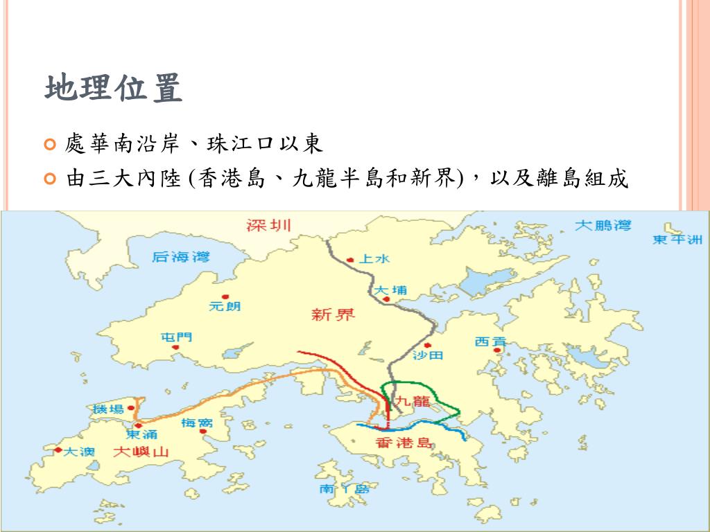 地理位置 • 處華南沿岸、珠江口以東 • 由三大內陸 (香港島、九龍半島和新界),以及離島組成