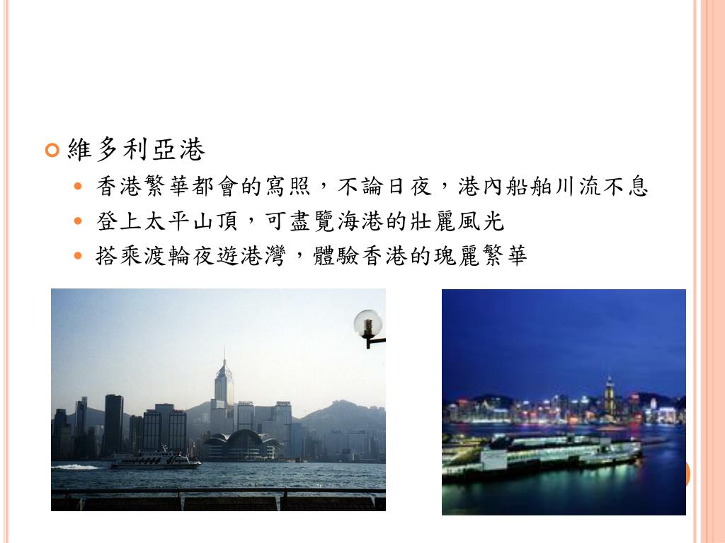 維多利亞港 • 香港繁華都會的寫照,不論日夜,港內船舶川流不息 • 登上太平山頂,可盡覽海港的壯麗風光 • 搭乘渡輪夜遊港灣,體驗香港的瑰麗繁華