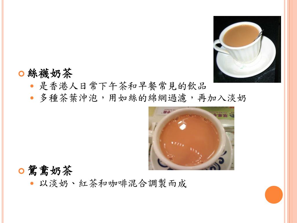 絲襪奶茶 • 是香港人日常下午茶和早餐常見的飲品 • 多種茶葉沖泡,用如絲的綿網過濾,再加入淡奶 • 鴛鴦奶茶 • 以淡奶、紅茶和咖啡混合調製而成