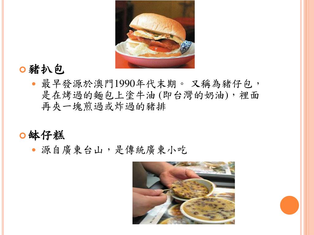豬扒包 • 最早發源於澳門1990年代末期。 又稱為豬仔包,是在烤過的麵包上塗牛油 (即台灣的奶油),裡面再夾一塊煎過或炸過的豬排 • 缽仔糕 • 源自廣東台山,是傳統廣東小吃