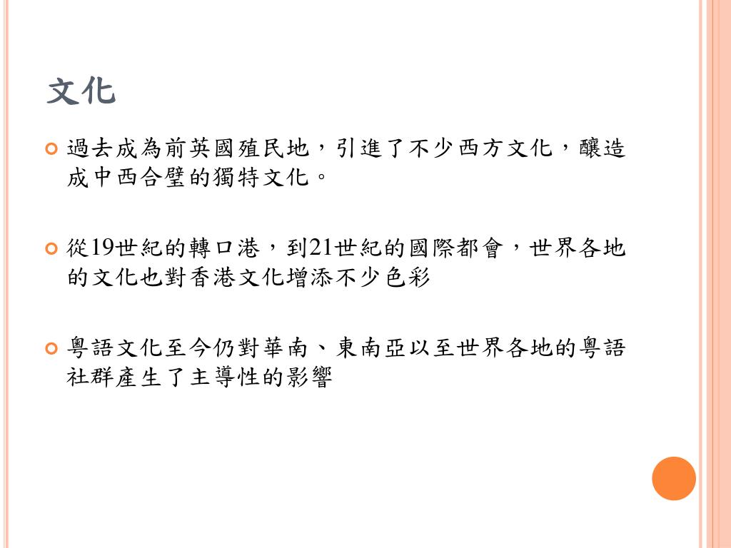 文化 • 過去成為前英國殖民地,引進了不少西方文化,釀造成中西合璧的獨特文化。 • 從19世紀的轉口港,到21世紀的國際都會,世界各地的文化也對香港文化增添不少色彩 • 粵語文化至今仍對華南、東南亞以至世界各地的粵語社群產生了主導性的影響