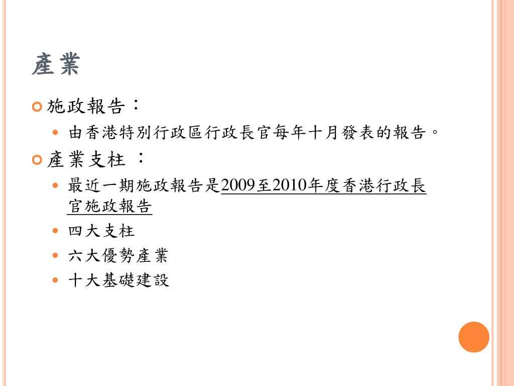 產業 • 施政報告: • 由香港特別行政區行政長官每年十月發表的報告。 • 產業支柱 : • 最近一期施政報告是2009至2010年度香港行政長官施政報告 • 四大支柱 • 六大優勢產業 • 十大基礎建設