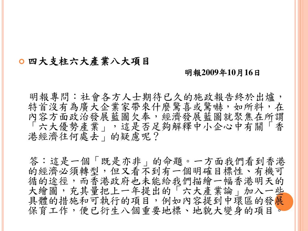 四大支柱六大產業八大項目 明報2009年10月16日 明報專問:社會各方人士期待已久的施政報告終於出爐,特首沒有為廣大企業家帶來什麼驚喜或驚嚇,如所料,在內容方面政治發展藍圖欠奉,經濟發展藍圖就聚焦在所謂「六大優勢產業」,這是否足夠解釋中小企心中有關「香港經濟往何處去」的疑慮呢? 答:這是一個「既是亦非」的命題。一方面我們看到香港的經濟必須轉型,但又看不到有一個明確目標性、有機可循的途徑,而香港政府也未能給我們描繪一幅香港明天的大繪圖,充其量把上一年提出的「六大產業論」加入一些具體的措施和可執行的項目,例如內容提到中環區的發展保育工作,便已衍生八個重要地標、地貌大變身的項目。