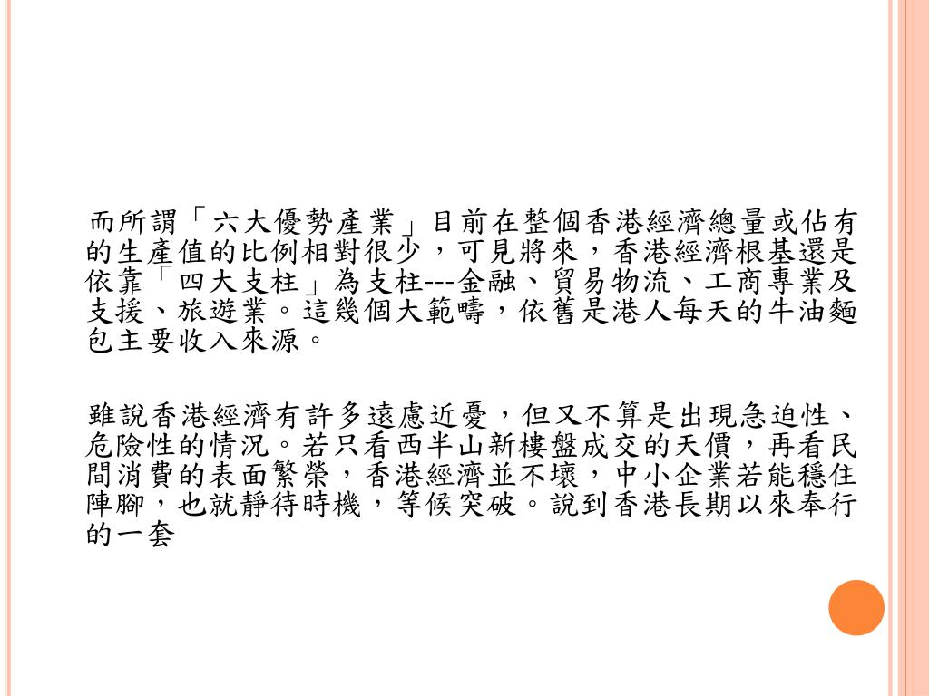 而所謂「六大優勢產業」目前在整個香港經濟總量或佔有的生產值的比例相對很少,可見將來,香港經濟根基還是依靠「四大支柱」為支柱---金融、貿易物流、工商專業及支援、旅遊業。這幾個大範疇,依舊是港人每天的牛油麵包主要收入來源。 雖說香港經濟有許多遠慮近憂,但又不算是出現急迫性、危險性的情況。若只看西半山新樓盤成交的天價,再看民間消費的表面繁榮,香港經濟並不壞,中小企業若能穩住陣腳,也就靜待時機,等候突破。說到香港長期以來奉行的一套