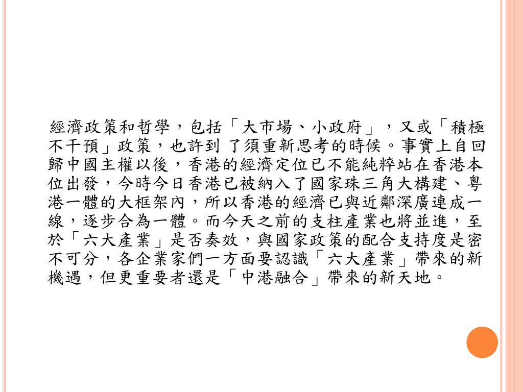 經濟政策和哲學,包括「大市場、小政府」,又或「積極不干預」政策,也許到 了須重新思考的時候。事實上自回歸中國主權以後,香港的經濟定位已不能純粹站在香港本位出發,今時今日香港已被納入了國家珠三角大構建、粵港一體的大框架內,所以香港的經濟已與近鄰深廣連成一線,逐步合為一體。而今天之前的支柱產業也將並進,至於「六大產業」是否奏效,與國家政策的配合支持度是密不可分,各企業家們一方面要認識「六大產業」帶來的新機遇,但更重要者還是「中港融合」帶來的新天地。