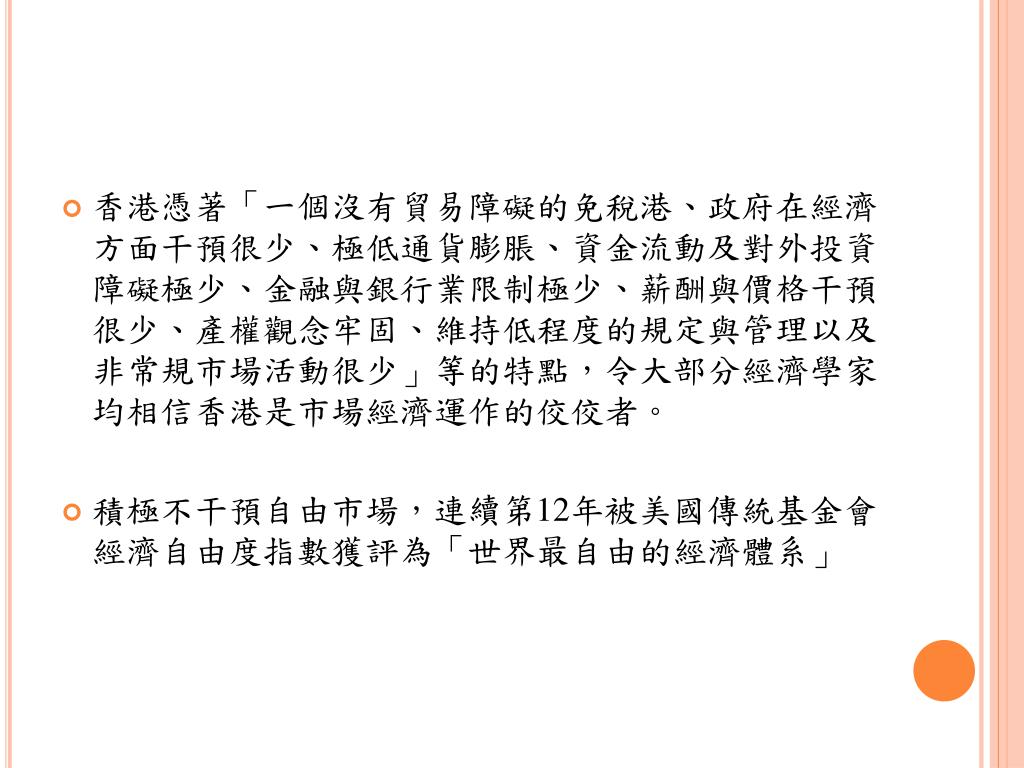 經濟 • 香港的經濟是一個高度依賴國際貿易的自由市場經濟系統;因為香港缺乏自然資源,食品及原料均需從外輸入,進口及出口(包括轉口)都超過國內生產總值。奉行自由市場資本主義經濟體系的香港,重點在於政府施行的自由放任政策。政府一直堅持維持低稅率的政策,以鼓勵貿易和生產。 • 利得稅稅率為17.5%,薪俸稅稅率則為15%,公司利得稅,在2008至09年調至16.5%,與其他國家的稅率相比,香港稅項相對上比較優惠。