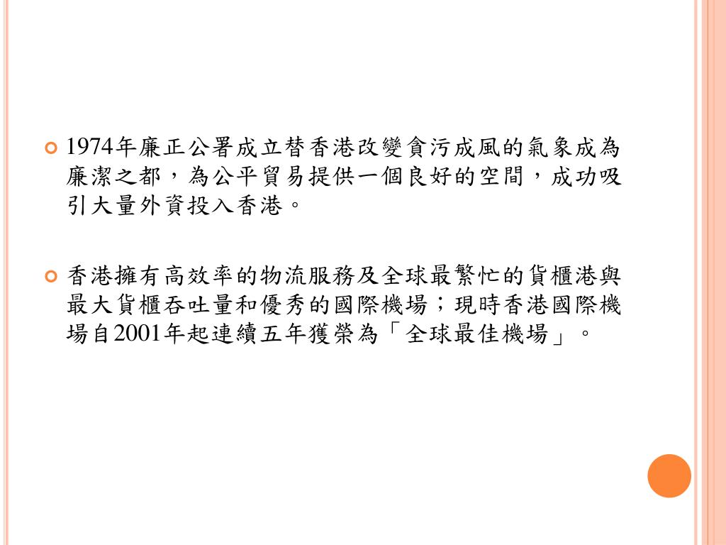 1974年廉正公署成立替香港改變貪污成風的氣象成為廉潔之都,為公平貿易提供一個良好的空間,成功吸引大量外資投入香港。1974年廉正公署成立替香港改變貪污成風的氣象成為廉潔之都,為公平貿易提供一個良好的空間,成功吸引大量外資投入香港。 • 香港擁有高效率的物流服務及全球最繁忙的貨櫃港與最大貨櫃吞吐量和優秀的國際機場;現時香港國際機場自2001年起連續五年獲榮為「全球最佳機場」。
