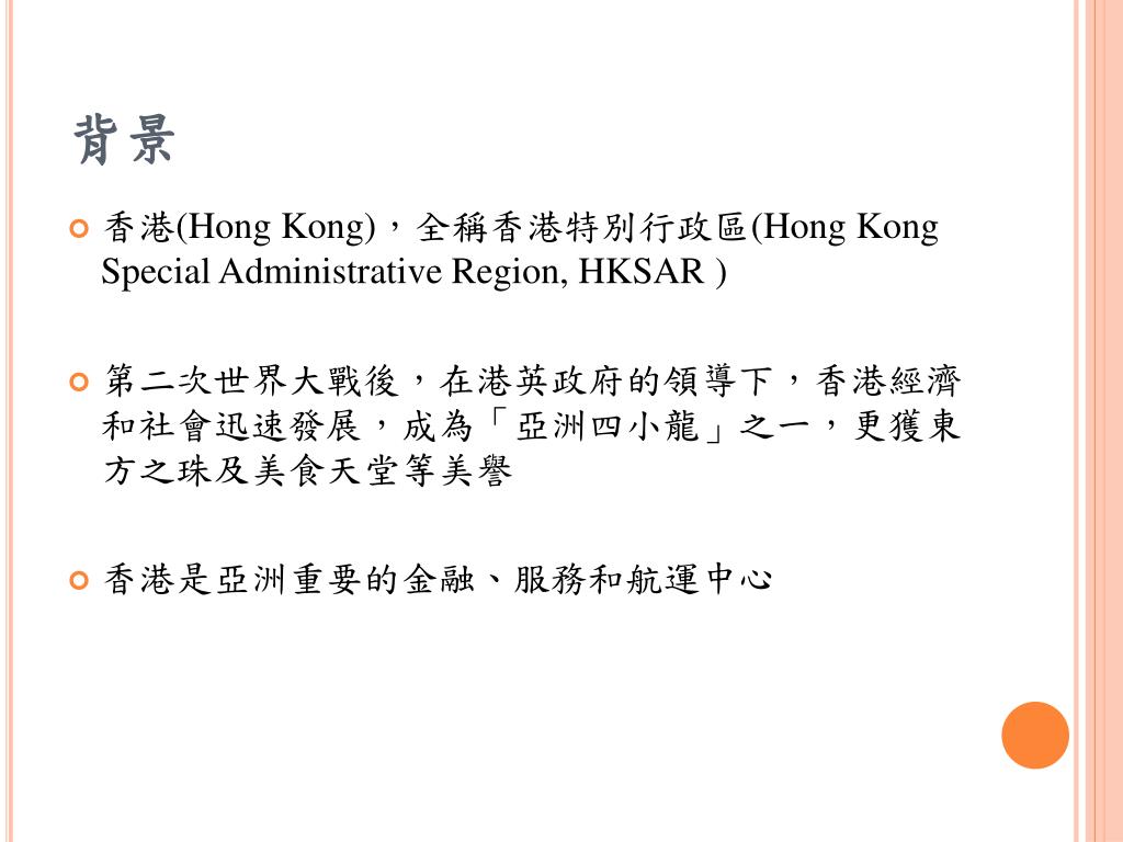 背景 • 香港(Hong Kong),全稱香港特別行政區(Hong Kong Special Administrative Region, HKSAR ) • 第二次世界大戰後,在港英政府的領導下,香港經濟和社會迅速發展,成為「亞洲四小龍」之一,更獲東方之珠及美食天堂等美譽 • 香港是亞洲重要的金融、服務和航運中心