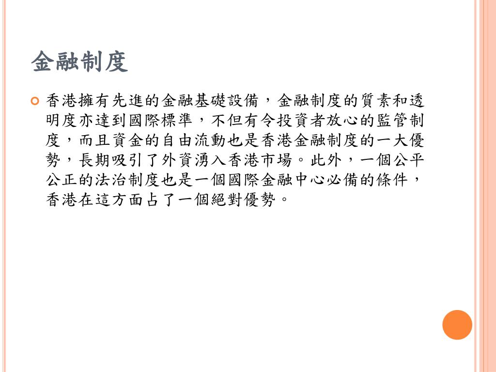 金融制度 • 香港擁有先進的金融基礎設備,金融制度的質素和透明度亦達到國際標準,不但有令投資者放心的監管制度,而且資金的自由流動也是香港金融制度的一大優勢,長期吸引了外資湧入香港市場。此外,一個公平公正的法治制度也是一個國際金融中心必備的條件,香港在這方面占了一個絕對優勢。