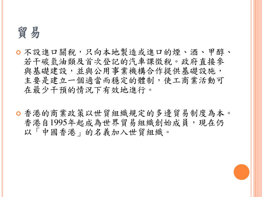 貿易 • 不設進口關稅,只向本地製造或進口的煙、酒、甲醇、若干碳氫油類及首次登記的汽車課徵稅。政府直接參與基礎建設,並與公用事業機構合作提供基礎設施,主要是建立一個適當而穩定的體制,使工商業活動可在最少干預的情況下有效地進行。 • 香港的商業政策以世貿組織規定的多邊貿易制度為本。香港自1995年起成為世界貿易組織創始成員,現在仍以「中國香港」的名義加入世貿組織。