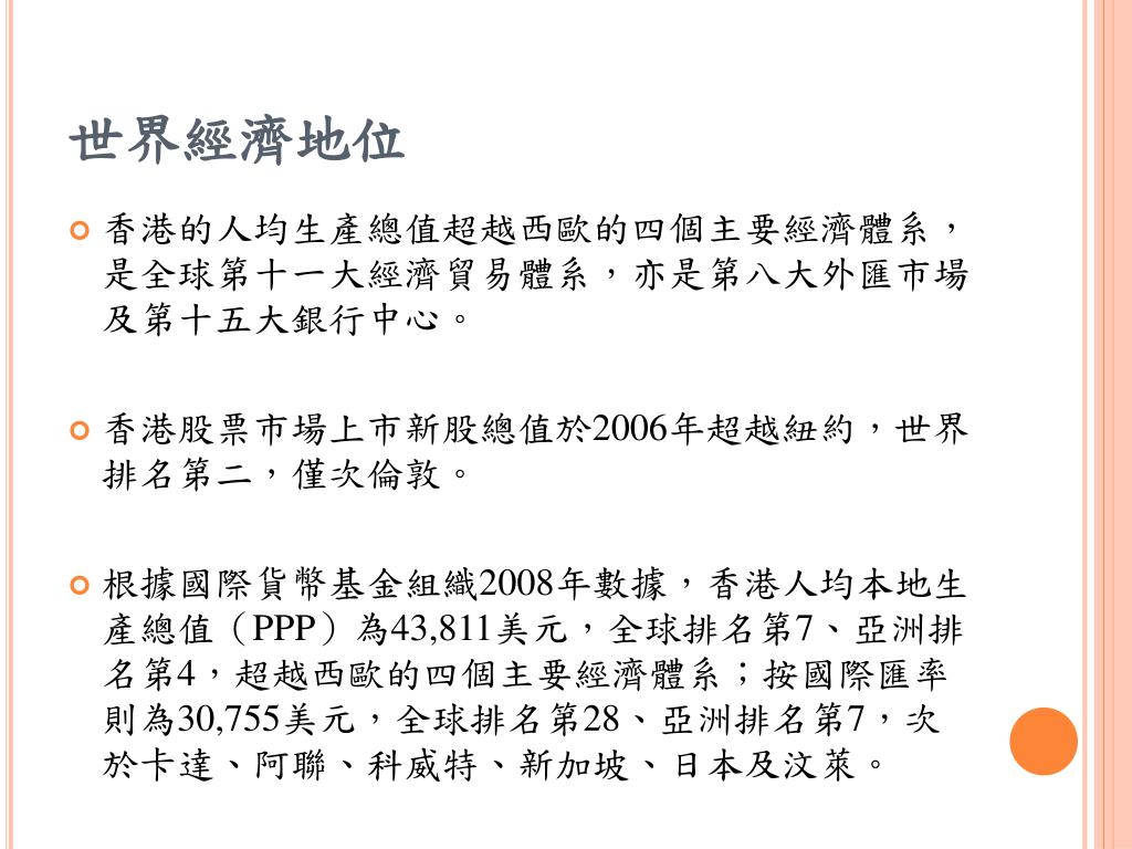 世界經濟地位 • 香港的人均生產總值超越西歐的四個主要經濟體系,是全球第十一大經濟貿易體系,亦是第八大外匯市場及第十五大銀行中心。 • 香港股票市場上市新股總值於2006年超越紐約,世界排名第二,僅次倫敦。 • 根據國際貨幣基金組織2008年數據,香港人均本地生產總值(PPP)為43,811美元,全球排名第7、亞洲排名第4,超越西歐的四個主要經濟體系;按國際匯率則為30,755美元,全球排名第28、亞洲排名第7,次於卡達、阿聯、科威特、新加坡、日本及汶萊。