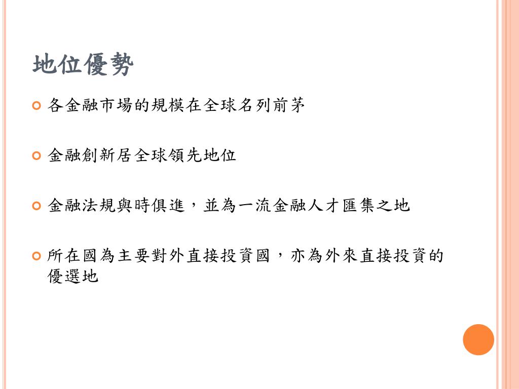 地位優勢 • 各金融市場的規模在全球名列前茅 • 金融創新居全球領先地位 • 金融法規與時俱進,並為一流金融人才匯集之地 • 所在國為主要對外直接投資國,亦為外來直接投資的優選地