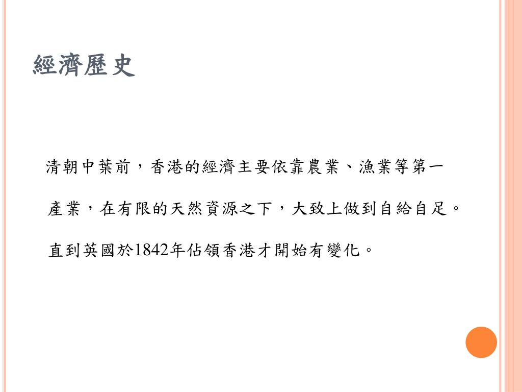 經濟歷史 清朝中葉前,香港的經濟主要依靠農業、漁業等第一產業,在有限的天然資源之下,大致上做到自給自足。直到英國於1842年佔領香港才開始有變化。