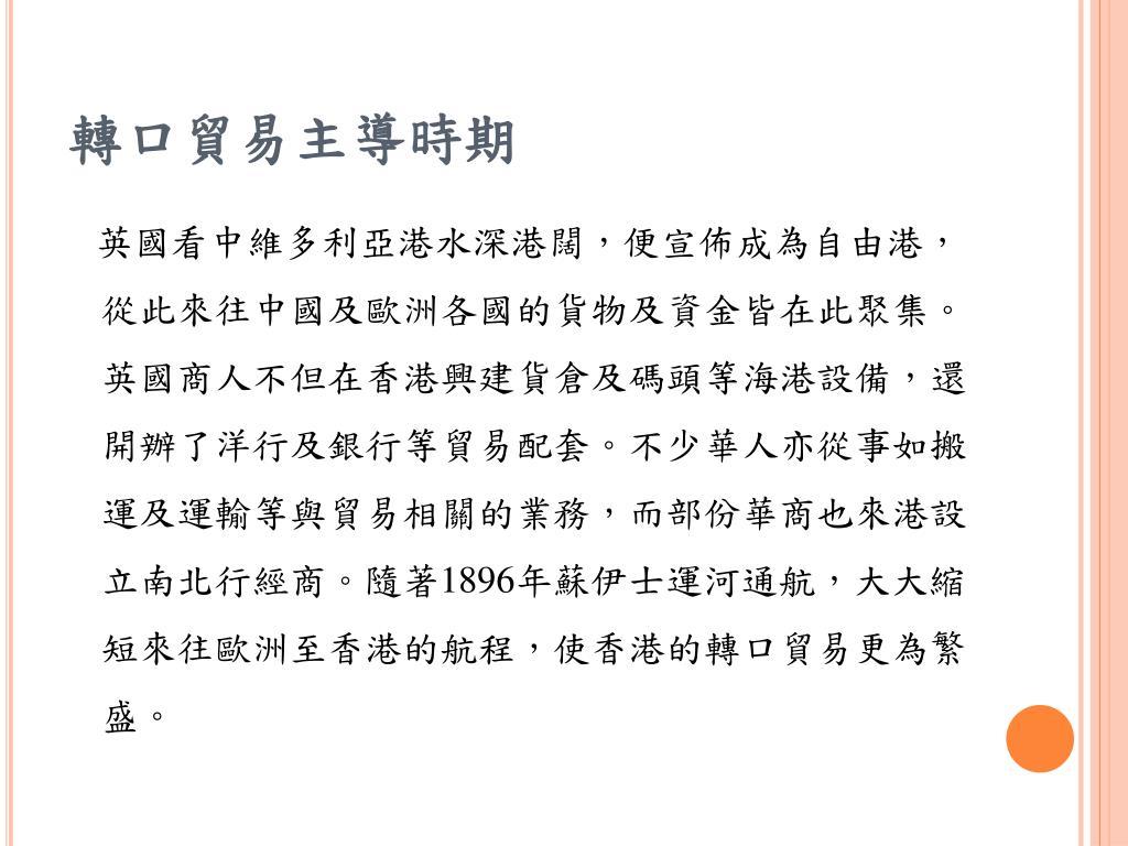 轉口貿易主導時期 英國看中維多利亞港水深港闊,便宣佈成為自由港,從此來往中國及歐洲各國的貨物及資金皆在此聚集。英國商人不但在香港興建貨倉及碼頭等海港設備,還開辦了洋行及銀行等貿易配套。不少華人亦從事如搬運及運輸等與貿易相關的業務,而部份華商也來港設立南北行經商。隨著1896年蘇伊士運河通航,大大縮短來往歐洲至香港的航程,使香港的轉口貿易更為繁盛。