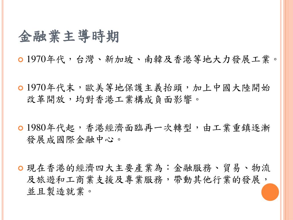 金融業主導時期 • 1970年代,台灣、新加坡、南韓及香港等地大力發展工業。 • 1970年代末,歐美等地保護主義抬頭,加上中國大陸開始改革開放,均對香港工業構成負面影響。 • 1980年代起,香港經濟面臨再一次轉型,由工業重鎮逐漸發展成國際金融中心。 • 現在香港的經濟四大主要產業為:金融服務、貿易、物流及旅遊和工商業支援及專業服務,帶動其他行業的發展,並且製造就業。