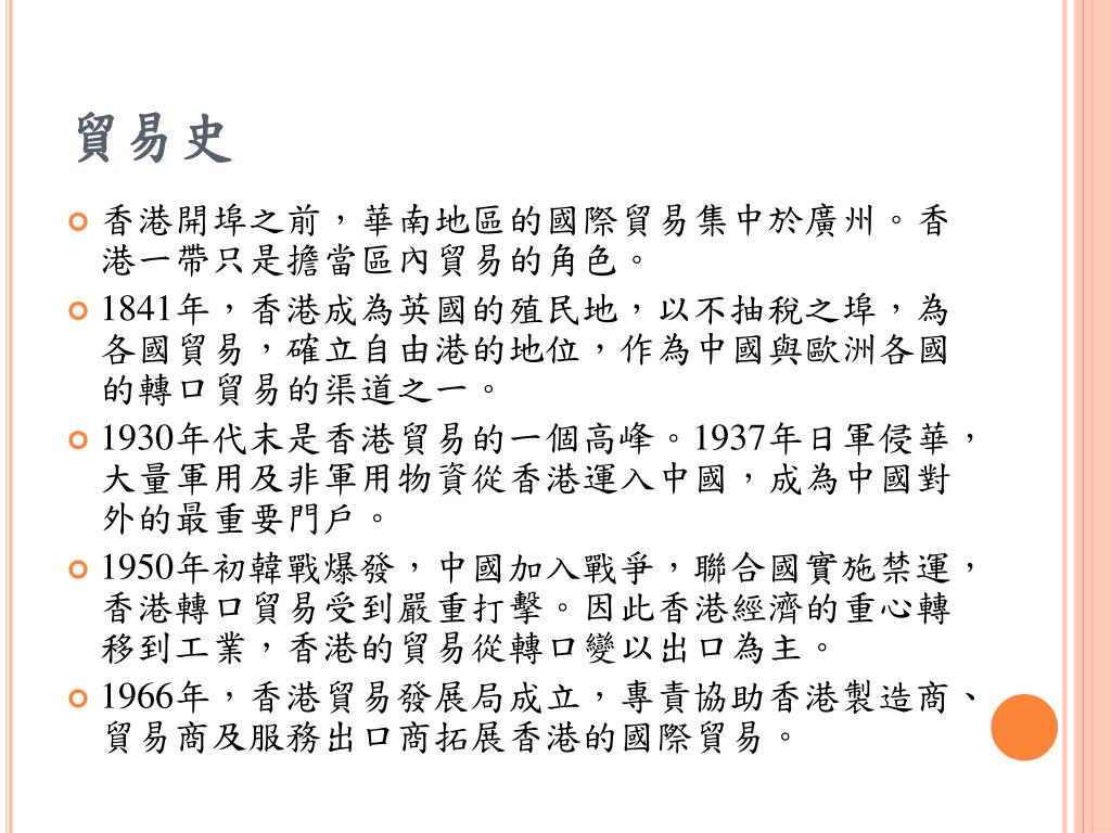 貿易史 • 香港開埠之前,華南地區的國際貿易集中於廣州。香港一帶只是擔當區內貿易的角色。 • 1841年,香港成為英國的殖民地,以不抽稅之埠,為各國貿易,確立自由港的地位,作為中國與歐洲各國的轉口貿易的渠道之一。 • 1930年代末是香港貿易的一個高峰。1937年日軍侵華,大量軍用及非軍用物資從香港運入中國,成為中國對外的最重要門戶。 • 1950年初韓戰爆發,中國加入戰爭,聯合國實施禁運,香港轉口貿易受到嚴重打擊。因此香港經濟的重心轉移到工業,香港的貿易從轉口變以出口為主。 • 1966年,香港貿易發展局成立,專責協助香港製造商、貿易商及服務出口商拓展香港的國際貿易。