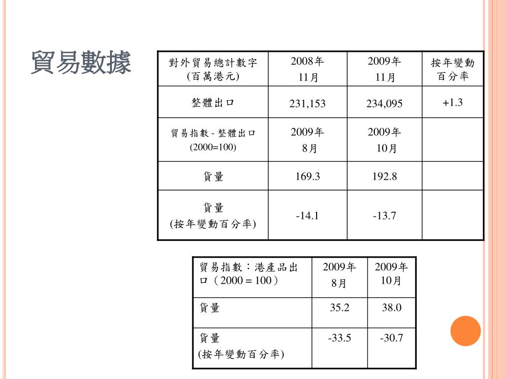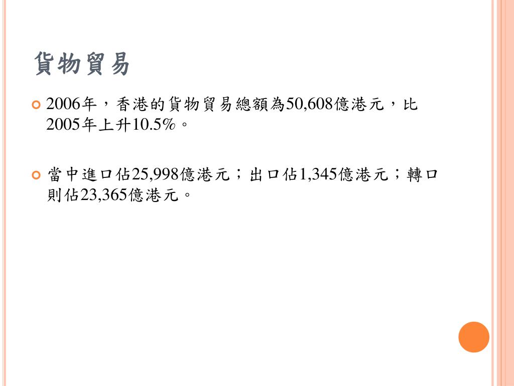 貨物貿易 • 2006年,香港的貨物貿易總額為50,608億港元,比2005年上升10.5%。 • 當中進口佔25,998億港元;出口佔1,345億港元;轉口則佔23,365億港元。
