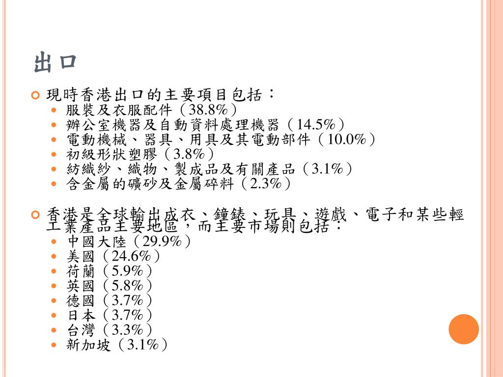 出口 • 現時香港出口的主要項目包括: • 服裝及衣服配件(38.8%) • 辦公室機器及自動資料處理機器(14.5%) • 電動機械、器具、用具及其電動部件(10.0%) • 初級形狀塑膠(3.8%) • 紡織紗、織物、製成品及有關產品(3.1%) • 含金屬的礦砂及金屬碎料(2.3%) • 香港是全球輸出成衣、鐘錶、玩具、遊戲、電子和某些輕工業產品主要地區,而主要市場則包括: • 中國大陸(29.9%) • 美國(24.6%) • 荷蘭(5.9%) • 英國(5.8%) • 德國(3.7%) • 日本(3.7%) • 台灣(3.3%) • 新加坡(3.1%)