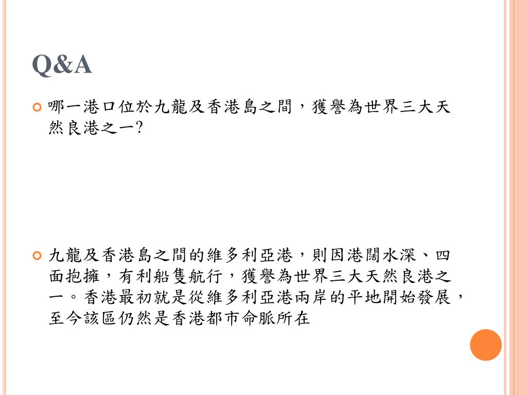 Q&A 哪一港口位於九龍及香港島之間,獲譽為世界三大天然良港之一? 九龍及香港島之間的維多利亞港,則因港闊水深、四面抱擁,有利船隻航行,獲譽為世界三大天然良港之一。香港最初就是從維多利亞港兩岸的平地開始發展,至今該區仍然是香港都市命脈所在