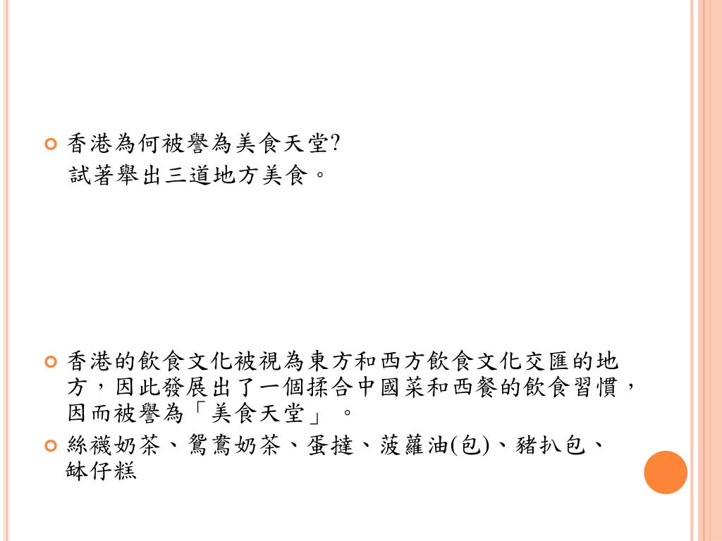 香港為何被譽為美食天堂? 試著舉出三道地方美食。 香港的飲食文化被視為東方和西方飲食文化交匯的地方,因此發展出了一個揉合中國菜和西餐的飲食習慣,因而被譽為「美食天堂」 。 絲襪奶茶、鴛鴦奶茶、蛋撻、菠蘿油(包)、豬扒包、缽仔糕