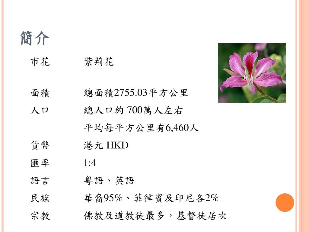 全球經貿分析 - 香港. 組別:第十組 組長: 4950P108 趙羚卉 組員: 4950P011 謝如萍 4950P041 吳思穎 4950P078 林琬暄 4950P091 張雅琄 4950P110 林汎樺 4950P113 王俐涵. 目錄. 香港基本介紹 旅遊景點 飲食文化 特殊節日 文化特色 產業結構 經貿環境. 背景. 香港 (Hong Kong) ,全稱香港特別行政區 (Hong Kong Special Administrative Region, HKSAR )