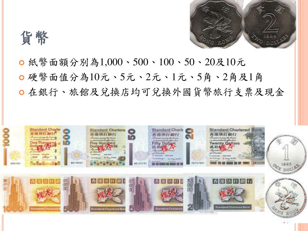 貨幣 • 紙幣面額分別為1,000、500、100、50、20及10元 • 硬幣面值分為10元、5元、2元、1元、5角、2角及1角 • 在銀行、旅館及兌換店均可兌換外國貨幣旅行支票及現金