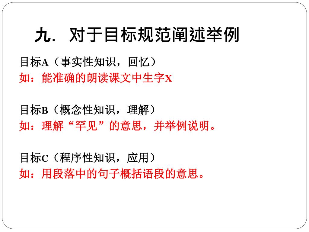 九.对于目标规范阐述举例 目标A(事实性知识,回忆) 如:能准确的朗读课文中生字X 目标B(概念性知识,理解) 如:理解“罕见”的意思,并举例说明。 目标C(程序性知识,应用) 如:用段落中的句子概括语段的意思。