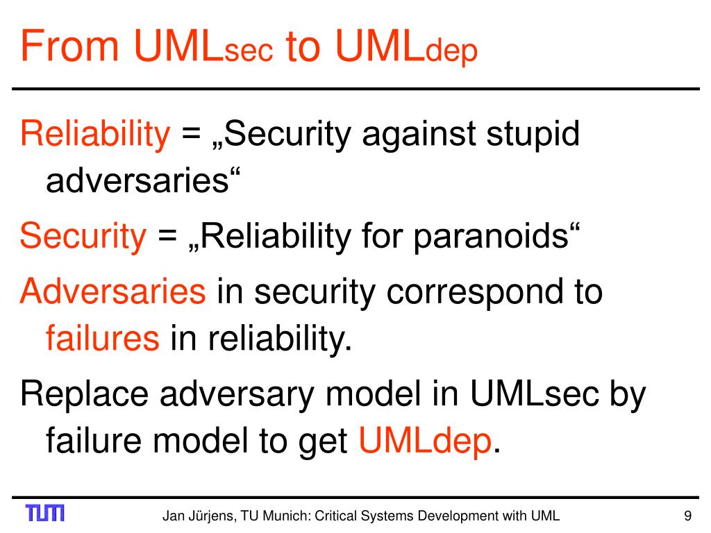 From UMLsec to UMLdep Reliability = „Security against stupid adversaries“ Security = „Reliability for paranoids“ Adversariesin security correspond to failuresin reliability. Replace adversary model in UMLsec by failure model to get UMLdep. Jan Jürjens, TU Munich: Critical Systems Development with UML