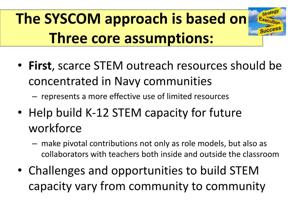 The SYSCOM approach is based on Three core assumptions: • First, scarce STEM outreach resources should be concentrated in Navy communities • represents a more effective use of limited resources • Help build K-12 STEM capacity for future workforce • make pivotal contributions not only as role models, but also as collaborators with teachers both inside and outside the classroom • Challenges and opportunities to build STEM capacity vary from community to community