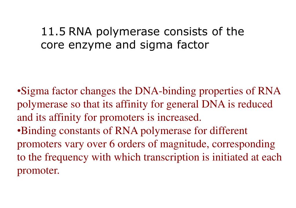 11.5RNA polymerase consists of the core enzyme and sigma factor • Sigma factor changes the DNA-binding properties of RNA polymerase so that its affinity for general DNA is reduced and its affinity for promoters is increased. • Binding constants of RNA polymerase for different promoters vary over 6 orders of magnitude, corresponding to the frequency with which transcription is initiated at each promoter.