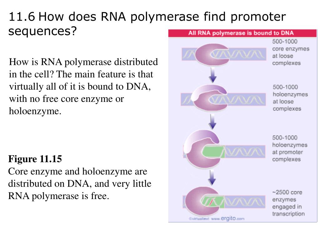 11.6How does RNA polymerase find promoter sequences? How is RNA polymerase distributed in the cell? The main feature is that virtually all of it is bound to DNA, with no free core enzyme or holoenzyme. Figure 11.15Core enzyme and holoenzyme are distributed on DNA, and very little RNA polymerase is free.