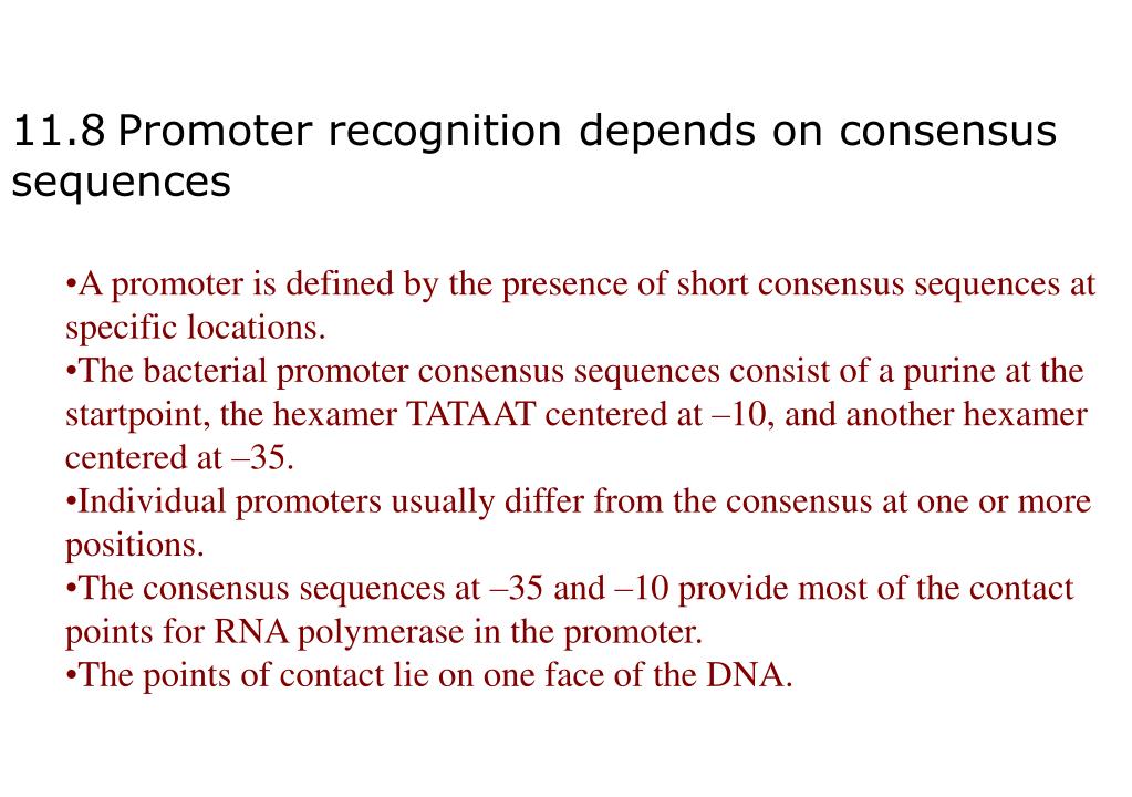 11.8Promoter recognition depends on consensus sequences • A consensus sequence is an idealized sequence in which each position represents the base most often found when many actual sequences are compared. There are four (perhaps five) conserved features in a bacterial promoter: startpoint: purine, CAT. –10 sequence: The consensus is TATAAT. –35 sequence: The consensus is TTGACA separation between the –10 and –35 sequences: 16-18 bp in 90% of promoters