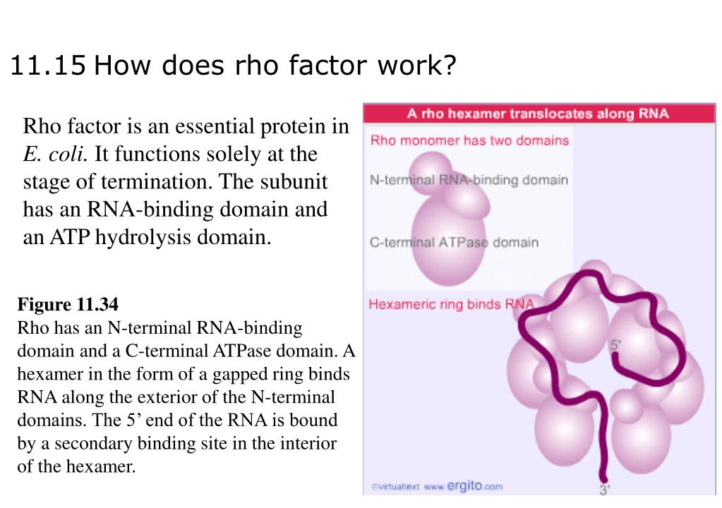 11.15How does rho factor work? Rho factor is an essential protein in E. coli. It functions solely at the stage of termination. The subunit has an RNA-binding domain and an ATP hydrolysis domain. Figure 11.34Rho has an N-terminal RNA-binding domain and a C-terminal ATPase domain. A hexamer in the form of a gapped ring binds RNA along the exterior of the N-terminal domains. The 5’ end of the RNA is bound by a secondary binding site in the interior of the hexamer.