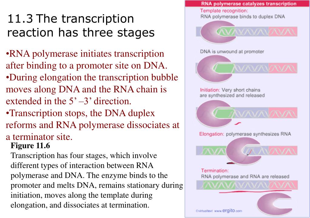 11.3The transcription reaction has three stages • RNA polymerase initiates transcription after binding to a promoter site on DNA. • During elongation the transcription bubble moves along DNA and the RNA chain is extended in the 5’ –3’ direction. • Transcription stops, the DNA duplex reforms and RNA polymerase dissociates at a terminator site. Figure 11.6Transcription has four stages, which involve different types of interaction between RNA polymerase and DNA. The enzyme binds to the promoter and melts DNA, remains stationary during initiation, moves along the template during elongation, and dissociates at termination.