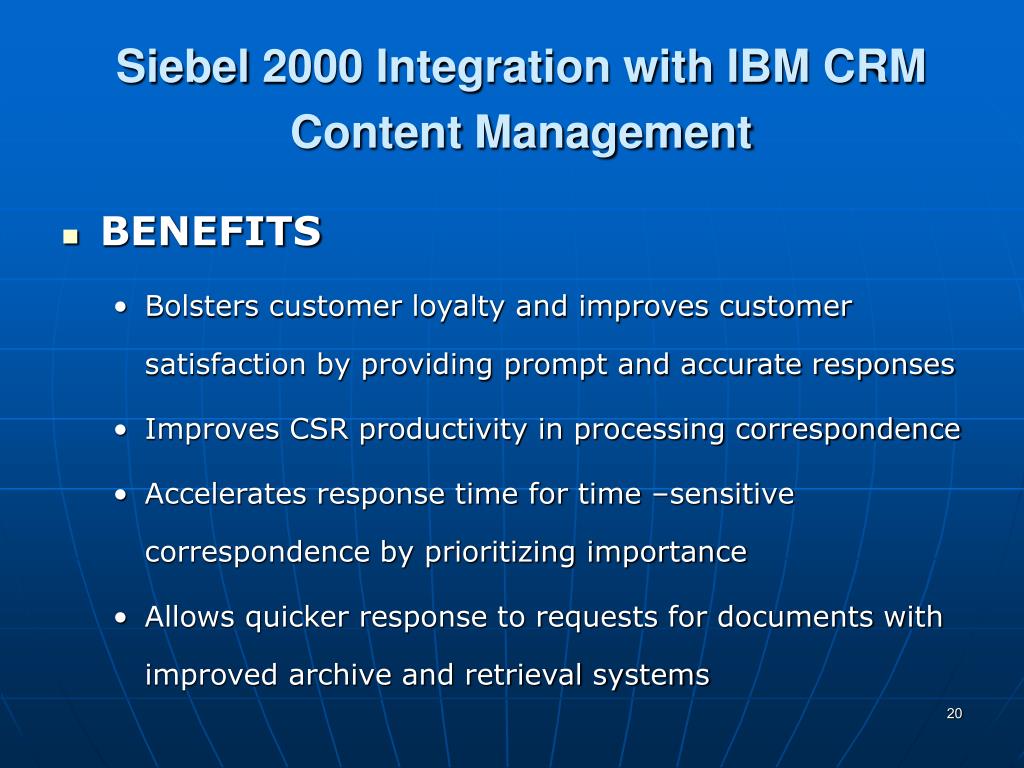 Siebel 2000 Integration with IBM CRM Content Management • BENEFITS • Bolsters customer loyalty and improves customer satisfaction by providing prompt and accurate responses • Improves CSR productivity in processing correspondence • Accelerates response time for time –sensitive correspondence by prioritizing importance • Allows quicker response to requests for documents with improved archive and retrieval systems