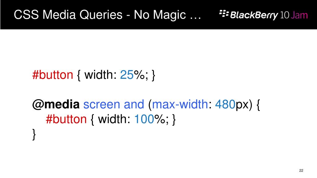 CSS Media Queries - No Magic … #button { width: 25%; } @mediascreen and (max-width: 480px) { #button{ width: 100%; } }
