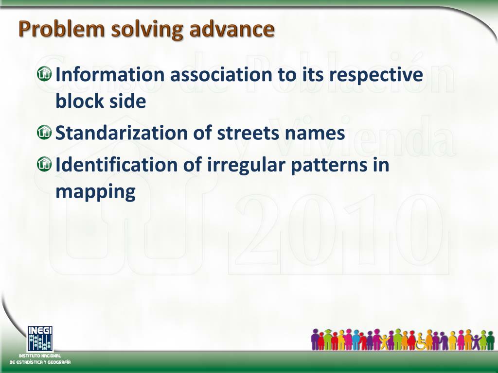 Problemsolvingadvance • Information association to its respective block side • Standarization of streets names • Identification of irregular patterns in mapping