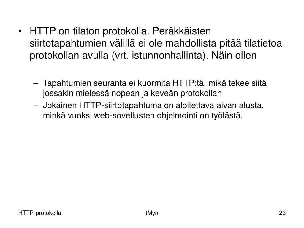 HTTP on tilaton protokolla. Peräkkäisten siirtotapahtumien välillä ei ole mahdollista pitää tilatietoa protokollan avulla (vrt. istunnonhallinta). Näin ollen • Tapahtumien seuranta ei kuormita HTTP:tä, mikä tekee siitä jossakin mielessä nopean ja keveän protokollan • Jokainen HTTP-siirtotapahtuma on aloitettava aivan alusta, minkä vuoksi web-sovellusten ohjelmointi on työlästä. tMyn