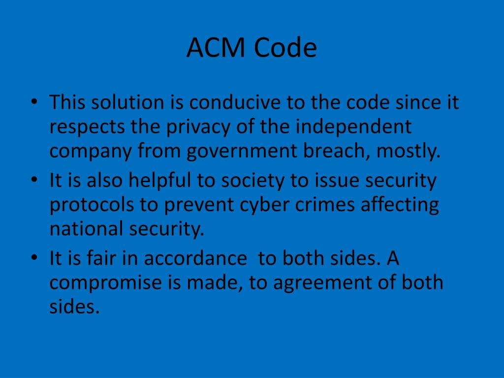ACM Code • This solution is conducive to the code since it respects the privacy of the independent company from government breach, mostly. • It is also helpful to society to issue security protocols to prevent cyber crimes affecting national security. • It is fair in accordance to both sides. A compromise is made, to agreement of both sides.
