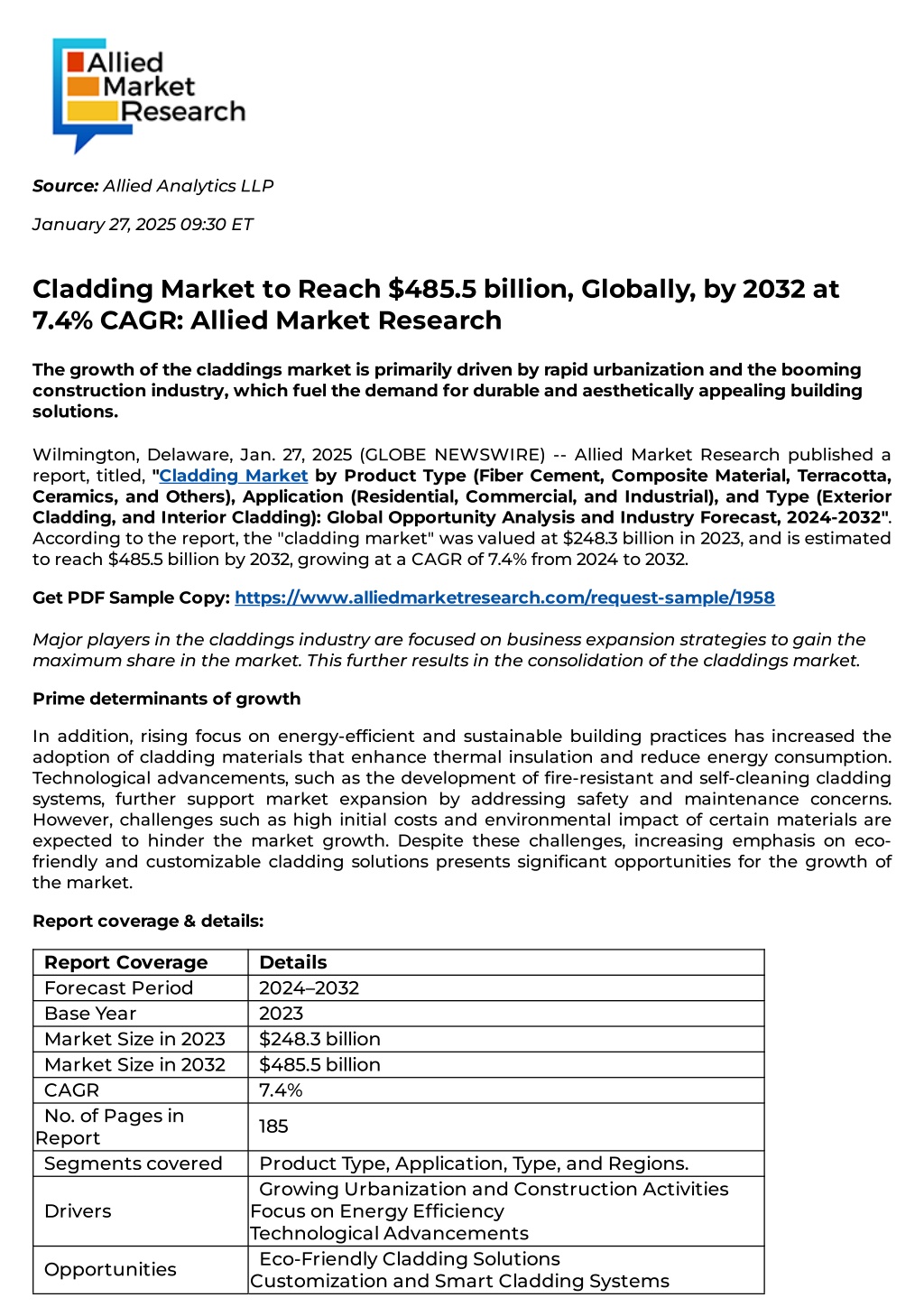 Source: Allied Analytics LLP January 27, 2025 09:30 ET Cladding Market to Reach $485.5 billion, Globally, by 2032 at 7.4% CAGR: Allied Market Research The growth of the claddings market is primarily driven by rapid urbanization and the booming construction industry, which fuel the demand for durable and aesthetically appealing building solutions. Wilmington, Delaware, Jan. 27, 2025 (GLOBE NEWSWIRE) -- Allied Market Research published a report, titled, "Cladding Market by Product Type (Fiber Cement, Composite Material, Terracotta, Ceramics, and Others), Application (Residential, Commercial, and Industrial), and Type (Exterior Cladding, and Interior Cladding): Global Opportunity Analysis and Industry Forecast, 2024-2032". According to the report, the "cladding market" was valued at $248.3 billion in 2023, and is estimated to reach $485.5 billion by 2032, growing at a CAGR of 7.4% from 2024 to 2032. Get PDF Sample Copy: https://www.alliedmarketresearch.com/request-sample/1958 Major players in the claddings industry are focused on business expansion strategies to gain the maximum share in the market. This further results in the consolidation of the claddings market. Prime determinants of growth In addition, rising focus on energy-ef?cient and sustainable building practices has increased the adoption of cladding materials that enhance thermal insulation and reduce energy consumption. Technological advancements, such as the development of ?re-resistant and self-cleaning cladding systems, further support market expansion by addressing safety and maintenance concerns. However, challenges such as high initial costs and environmental impact of certain materials are expected to hinder the market growth. Despite these challenges, increasing emphasis on eco- friendly and customizable cladding solutions presents signi?cant opportunities for the growth of the market. Report coverage & details: Report Coverage Forecast Period Base Year Market Size in 2023 $248.3 billion Market Size in 2032 $485.5 billion CAGR No. of Pages in Report Segments covered Product Type, Application, Type, and Regions. Growing Urbanization and Construction Activities Focus on Energy Ef?ciency Technological Advancements Eco-Friendly Cladding Solutions Customization and Smart Cladding Systems Details 2024–2032 2023 7.4% 185 Drivers Opportunities