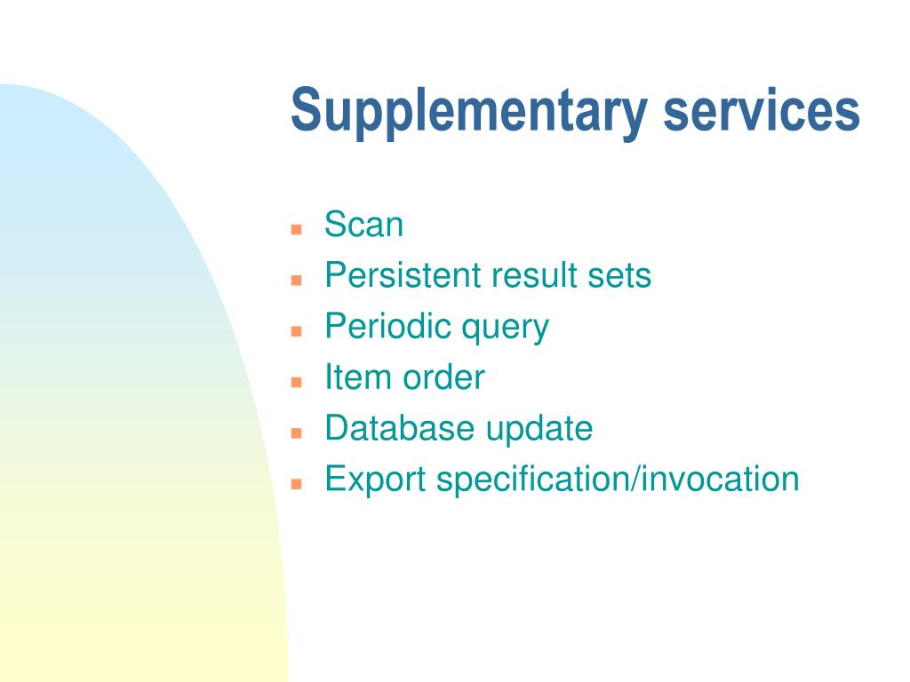 Supplementary services • Scan • Persistent result sets • Periodic query • Item order • Database update • Export specification/invocation