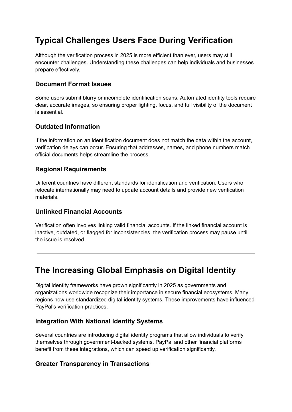 Typical Challenges Users Face During Verification Although the verification process in 2025 is more efficient than ever, users may still encounter challenges. Understanding these challenges can help individuals and businesses prepare effectively. Document Format Issues Some users submit blurry or incomplete identification scans. Automated identity tools require clear, accurate images, so ensuring proper lighting, focus, and full visibility of the document is essential. Outdated Information If the information on an identification document does not match the data within the account, verification delays can occur. Ensuring that addresses, names, and phone numbers match official documents helps streamline the process. Regional Requirements Different countries have different standards for identification and verification. Users who relocate internationally may need to update account details and provide new verification materials. Unlinked Financial Accounts Verification often involves linking valid financial accounts. If the linked financial account is inactive, outdated, or flagged for inconsistencies, the verification process may pause until the issue is resolved. The Increasing Global Emphasis on Digital Identity Digital identity frameworks have grown significantly in 2025 as governments and organizations worldwide recognize their importance in secure financial ecosystems. Many regions now use standardized digital identity systems. These improvements have influenced PayPal’s verification practices. Integration With National Identity Systems Several countries are introducing digital identity programs that allow individuals to verify themselves through government-backed systems. PayPal and other financial platforms benefit from these integrations, which can speed up verification significantly. Greater Transparency in Transactions