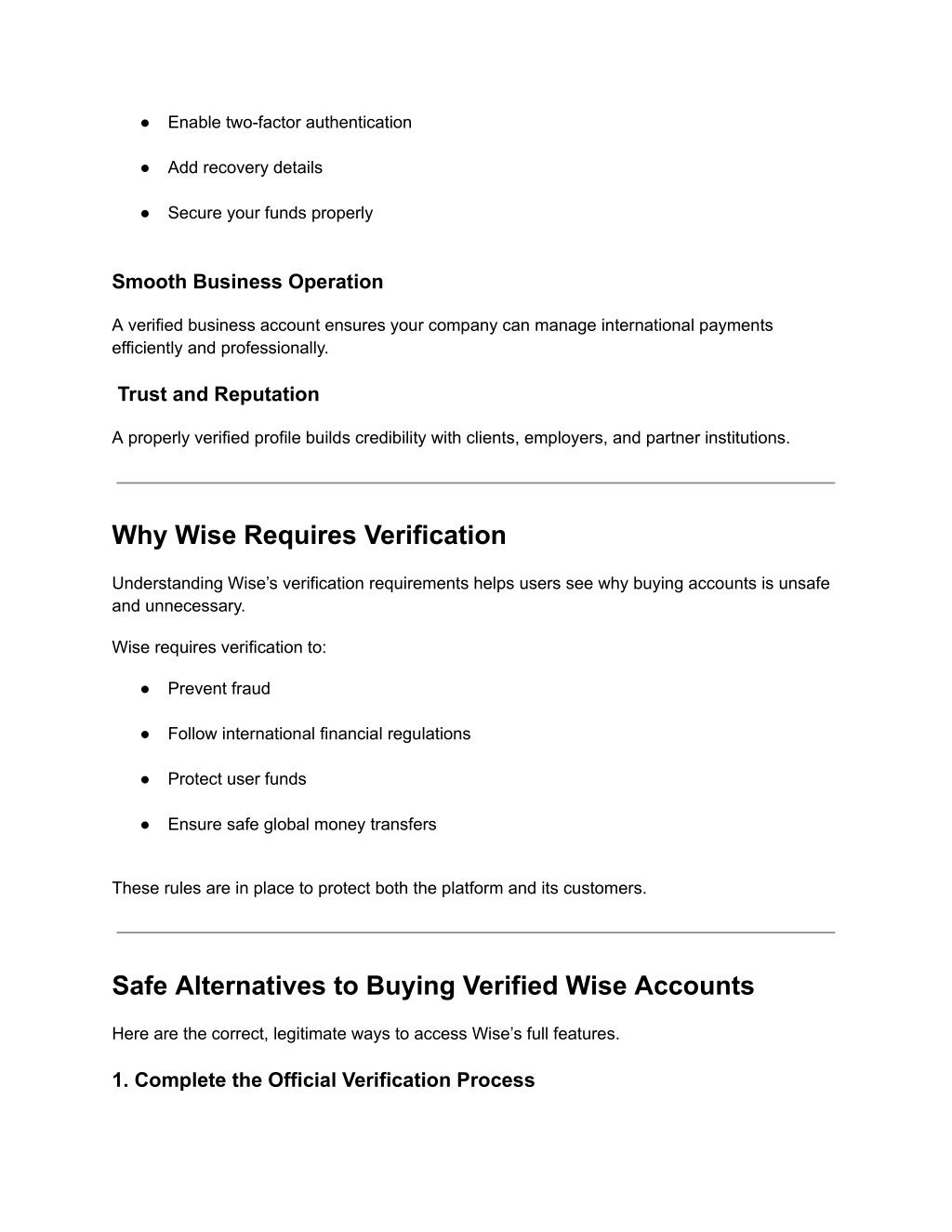 5. ● Enable two-factor authentication ● Add recovery details ● Secure your funds properly Smooth Business Operation A verified business account ensures your company can manage international payments efficiently and professionally. Trust and Reputation A properly verified profile builds credibility with clients, employers, and partner institutions. Why Wise Requires Verification Understanding Wise’s verification requirements helps users see why buying accounts is unsafe and unnecessary. Wise requires verification to: ● Prevent fraud ● Follow international financial regulations ● Protect user funds ● Ensure safe global money transfers These rules are in place to protect both the platform and its customers. Safe Alternatives to Buying Verified Wise Accounts Here are the correct, legitimate ways to access Wise’s full features. 1. Complete the Official Verification Process