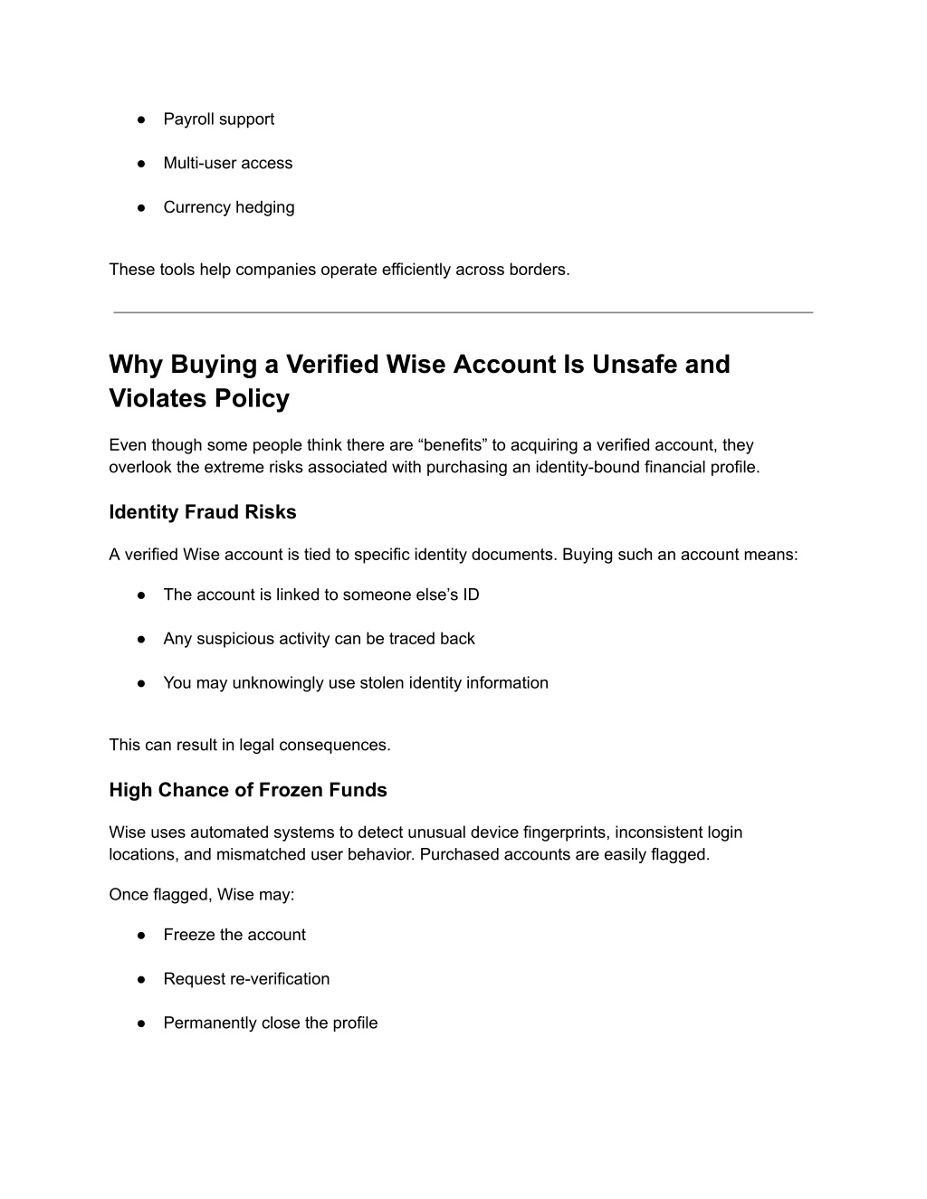 3. ● Payroll support ● Multi-user access ● Currency hedging These tools help companies operate efficiently across borders. Why Buying a Verified Wise Account Is Unsafe and Violates Policy Even though some people think there are “benefits” to acquiring a verified account, they overlook the extreme risks associated with purchasing an identity-bound financial profile. Identity Fraud Risks A verified Wise account is tied to specific identity documents. Buying such an account means: ● The account is linked to someone else’s ID ● Any suspicious activity can be traced back ● You may unknowingly use stolen identity information This can result in legal consequences. High Chance of Frozen Funds Wise uses automated systems to detect unusual device fingerprints, inconsistent login locations, and mismatched user behavior. Purchased accounts are easily flagged. Once flagged, Wise may: ● Freeze the account ● Request re-verification ● Permanently close the profile
