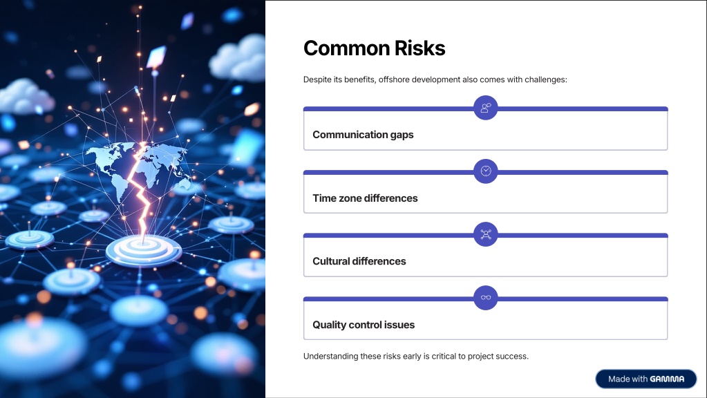 6. Common Risks Despite its benefits, offshore development also comes with challenges: Communication gaps Time zone differences Cultural differences Quality control issues Understanding these risks early is critical to project success.