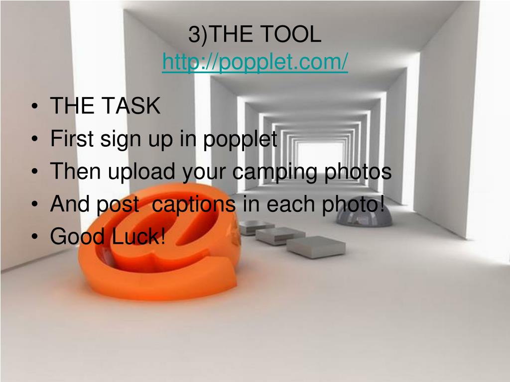 3)THE TOOLhttp://popplet.com/ • THE TASK • First sign up in popplet • Then upload your camping photos • And post captions in each photo! • Good Luck!