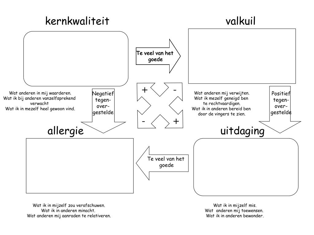 kernkwaliteit valkuil Te veel van het goede Te veel van het goede Te veel van het goede + - Wat anderen in mij waarderen. Wat ik bij anderen vanzelfsprekend verwacht Wat ik in mezelf heel gewoon vind. Negatief tegen- over- gestelde Wat anderen mij verwijten. Wat ik mezelf geneigd ben te rechtvaardigen. Wat ik in anderen bereid ben door de vingers te zien. Positief tegen- over- gestelde - + allergie uitdaging Te veel van het goede Wat ik in mijzelf zou verafschuwen. Wat ik in anderen minacht. Wat anderen mij aanraden te relativeren. Wat ik in mijzelf mis. Wat anderen mij toewensen. Wat ik in anderen bewonder.
